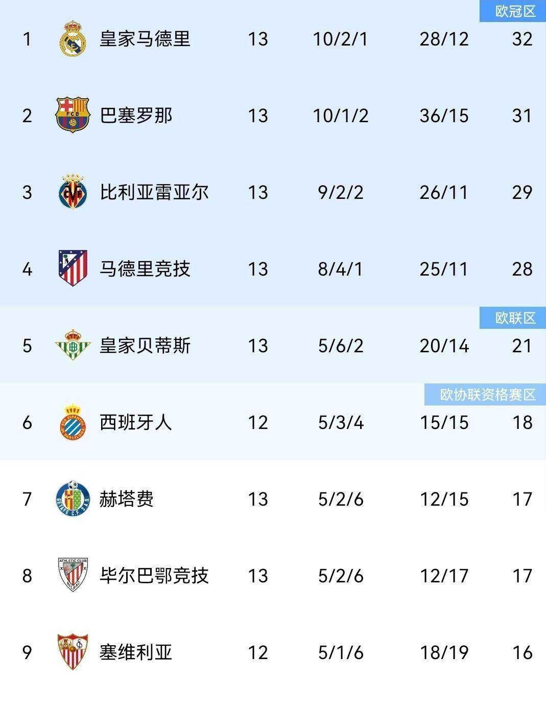 目前,贝蒂斯(20分)、西班牙人(18分)、毕尔巴鄂竞技和赫塔费(同积17分)形成欧战资格争夺集团,分差仅3分。 其中,西班牙人与塞维利亚的下一轮直接对话,可能进一步搅乱中游格局。