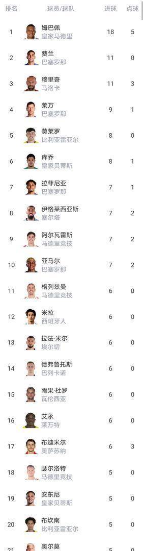 姆巴佩以18球领跑射手榜,几乎锁定西甲金靴。 但这一数据背后是皇马进攻端的隐忧:除他以外,球队第二射手仅打入5球。