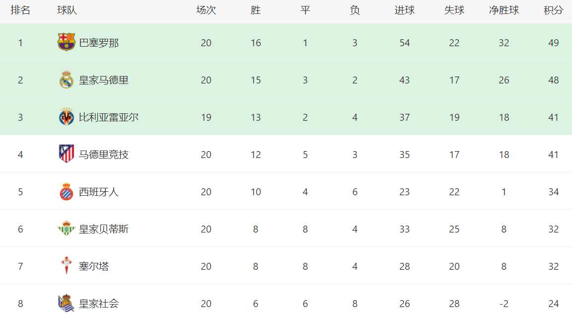 在积分榜上,输球的巴萨依然排名榜首。巴萨的战绩是16胜1平3负,拿到49分。皇马的劣势已经变得很小了,总积分是48分,只落后巴萨1分排名第2。皇马最快下一轮有希望超越巴萨登顶,当然,前提就是巴萨再次丢分。比利亚雷亚尔拿到41分,排名第3。赢球的马竞总积分也是41分,排名第4。西班牙人34分排名第5。返回搜狐,查看更多