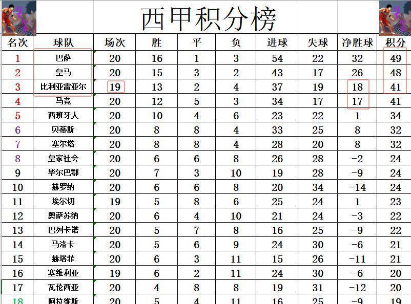 本轮战罢,西甲积分榜形势发生显著变化。 巴萨以49分继续领跑,但皇马凭借2-0战胜莱万特,积分达到48分,将差距缩小至1分。 马竞1-0小胜阿拉维斯,与比利亚雷亚尔同积41分,分列第三、四位,西甲争冠从双雄对峙演变为四强混战。