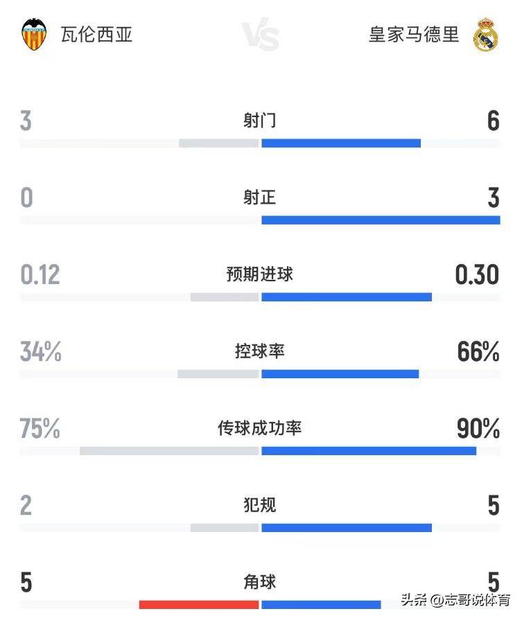 从上半场来看,瓦伦西亚更多的还是在被动防守,没办法,两队的实力差距有些大,皇马控球率超过了60%,射门6-3、射正3-0,均领先瓦伦西亚队,传球成功功率方面,皇马也是高达90%,角球都是5个。当然瓦伦西亚的防守很不错,抵挡住了皇马的多次有威胁的进攻,皇马迟迟无法打破僵局。