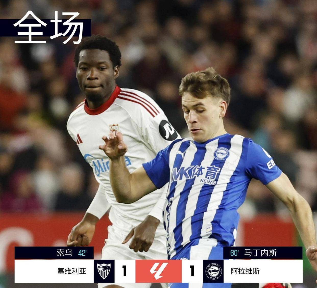 塞维利亚和阿拉维斯踢成了1比1平局。上半场第42分钟,索乌一脚远射破门,帮助塞维利亚以1比0领先结束上半场。下半场第60分钟,托尼·马丁内斯头球把比分扳成1比1。最后两队都没能再进球,各拿了一分。