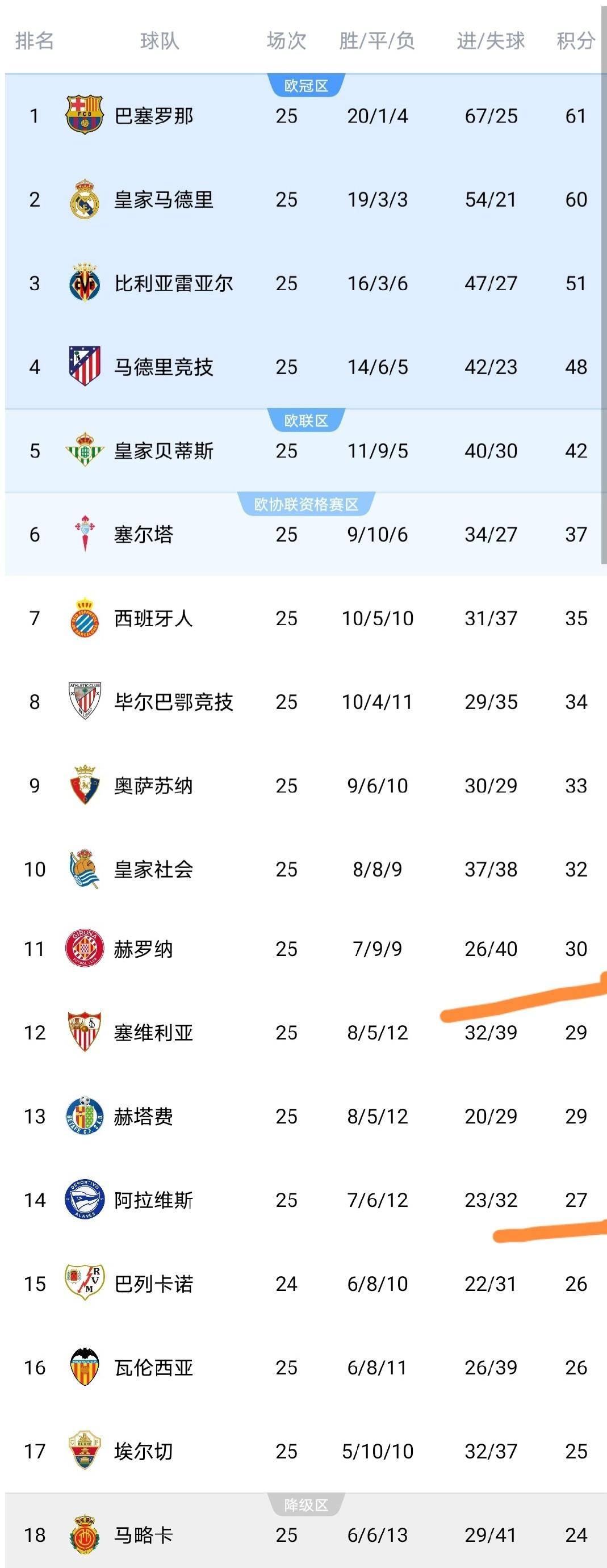 这场比赛的终场哨响,也标志着西甲第25轮所有比赛全部结束。 完整的积分榜随即出炉,最大的看点,果然出现在了最顶端。