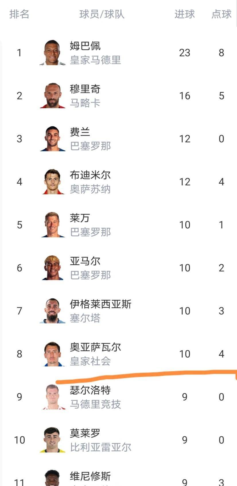 说完了积分榜,再来看看射手榜。 目前的射手王依然是皇马的超级前锋姆巴佩,他的进球数已经达到了23个,在射手榜上一骑绝尘。