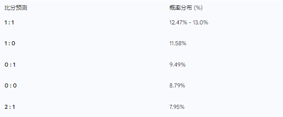 泊松模型强烈暗示这可能是一场由于双方进攻终结能力不足而导致的低分局。1-1 和 1-0 的概率总和超过了 24%,与两队过去在孙莫伊什球场的历史趋势相符 。
