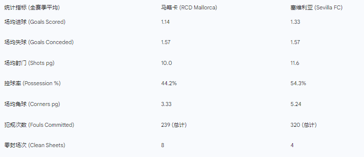 数据揭示了一个有趣的现象:尽管塞维利亚在积分榜上位置更高,但其防守稳健度远不如马略卡。马略卡拥有8场零封,而塞维利亚仅有4场 。这表明塞维利亚的比赛往往更具观赏性(进球多且失球多),而马略卡则倾向于通过压缩空间来获取积分。塞维利亚320次的犯规总数位居联赛前列,这暗示了其防守体系在面对快速反击时往往被迫采取战术违规 。
