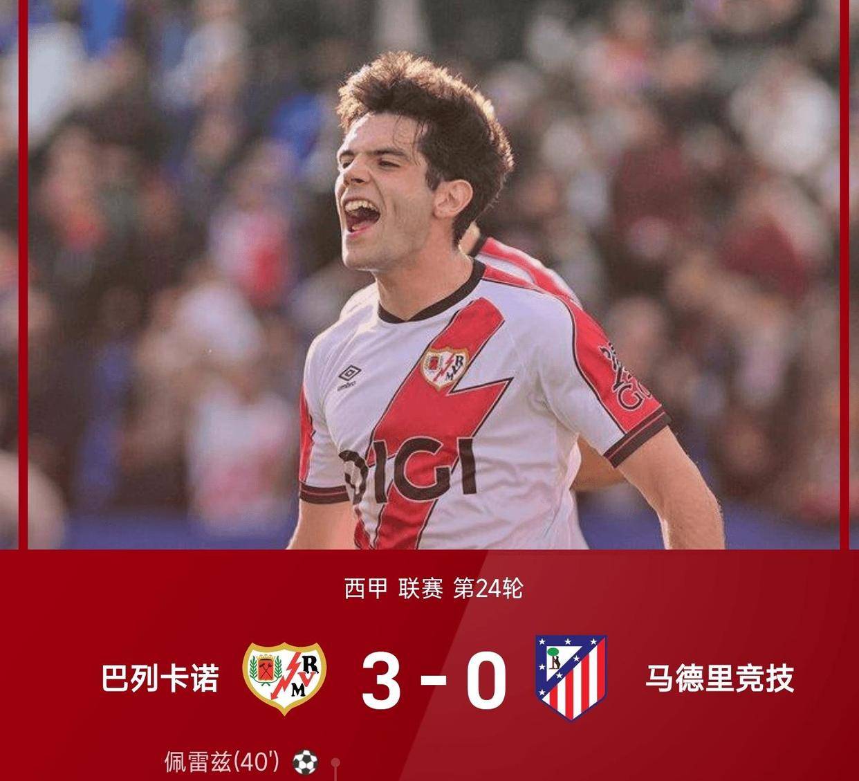 巴列卡诺则打出了一场经典的以弱胜强的比赛。 他们从开场就采用高位逼抢,针对马竞轮换阵容默契度不足的弱点持续施压。 两个边路的进攻非常活跃,传中质量很高,三个进球分别来自右路横传、门前补射和角球进攻,充分展现了定位球和传中战术的威力。 这场胜利对他们保级信心的提升是巨大的。
