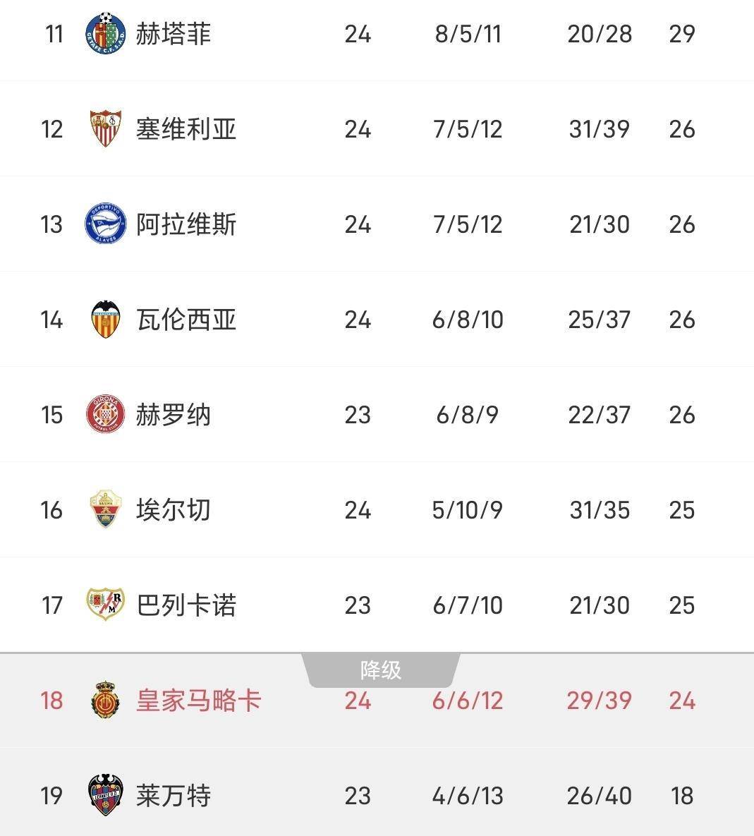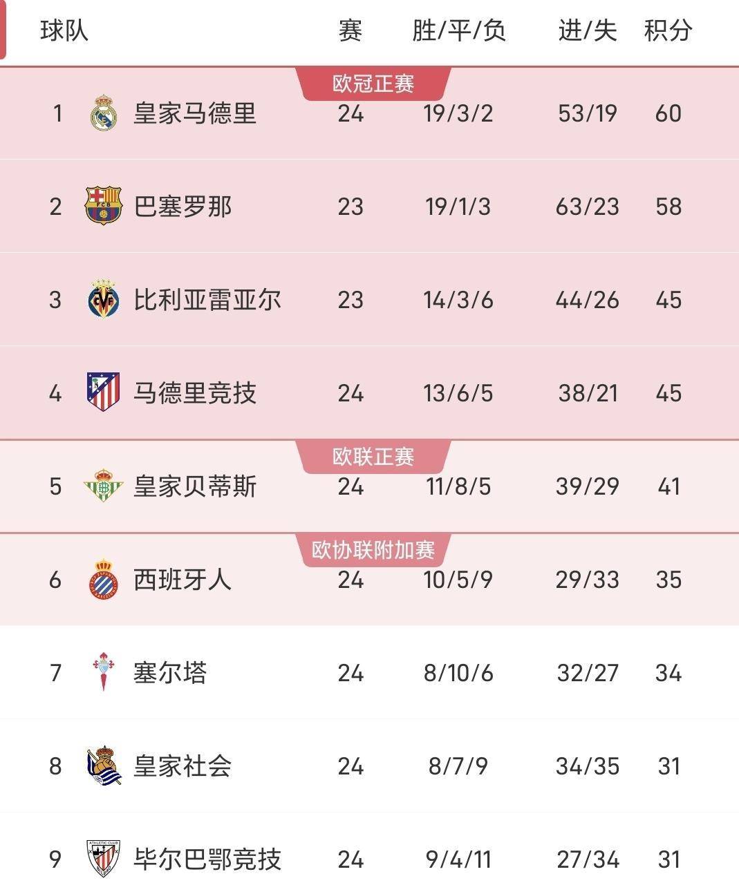 随着这四场比赛全部结束,西甲联赛第24轮后的积分榜发生了显著变化。 皇家马德里凭借一场大胜,积分达到60分,暂时超越少赛一场的巴塞罗那,登上了积分榜首位。 巴塞罗那以58分位列第二。 比利亚雷亚尔和马德里竞技同积45分,但由于净胜球优势,比利亚雷亚尔升至第三,而遭遇惨败的马竞则跌至第四位。 马竞在短短几天内,从横扫巴萨的云端,跌落到被保级队羞辱的谷底,其联赛排名也反映了这种巨大的状态波动。