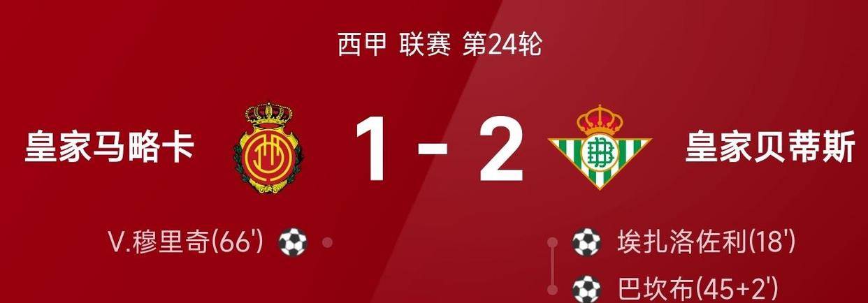 在马略卡主场,皇家贝蒂斯延续了良好的势头。 比赛第18分钟,贝蒂斯边锋安东尼右路内切后打门被门将扑出,跟进的埃扎洛佐利补射入网,贝蒂斯1比0领先。 上半场补时阶段,安东尼送出直塞,插上的巴坎布抽射破门,将比分扩大为2比0。 下半场第66分钟,马略卡前锋穆里奇头球吊射破门,扳回一城,但最终未能改写1比2的比分。 贝蒂斯从客场带走了三分。