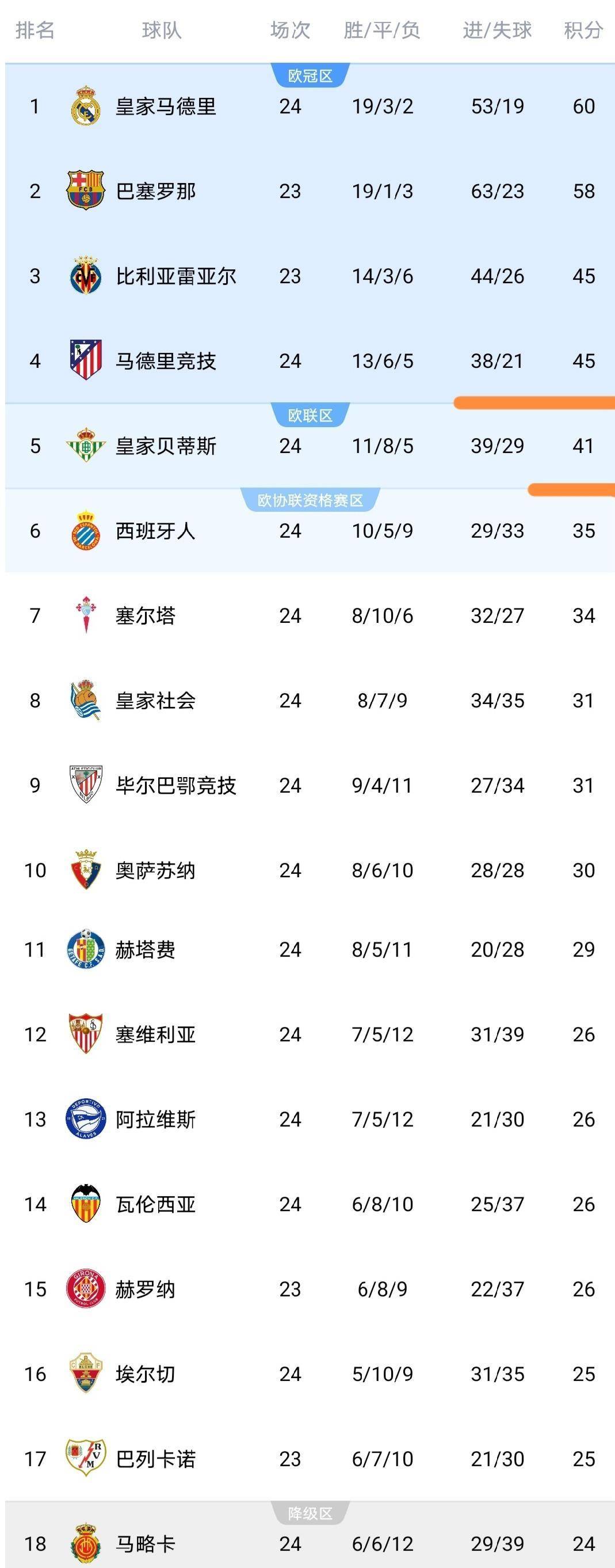 这一系列比赛结束后,西甲积分榜发生了显著变化。 皇家马德里以60分领跑,巴塞罗那58分紧随其后,但巴萨少赛一轮,争冠主动权依然掌握在自己手中。 比利亚雷亚尔和马竞同积45分,比利亚雷亚尔凭借净胜球优势升至第三,马竞跌至第四。 皇家贝蒂斯41分排名第五,西班牙人35分位列第六。