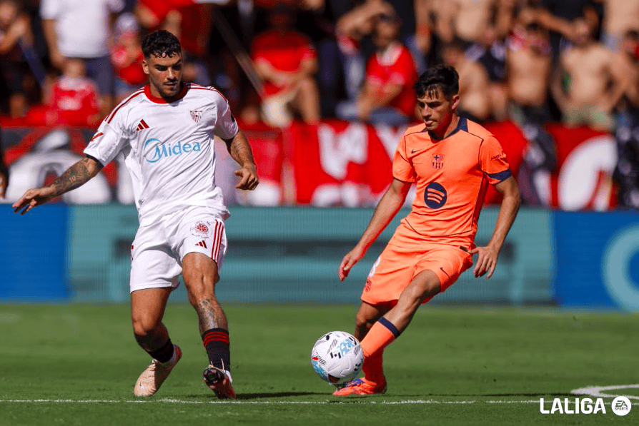 第22分钟,塞维利亚通过快速传球制造威胁,门迪在后点的射门稍稍偏出。两分钟后,桑切斯在巴萨禁区内的巧妙运作险些再次得手,伊萨克·罗梅罗的外脚背射门擦柱而出。接着,塞维利亚再次通过简单配合撕开巴萨防线,虽然罗梅罗的射门被斯琴什尼扑出,但如果不是这位老门将的神勇发挥,巴萨可能已经大比分落后。
