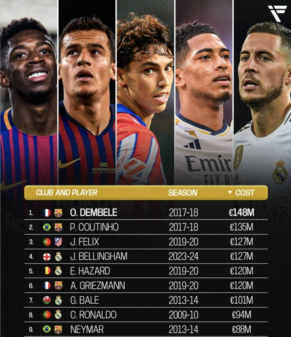 西甲直播,西甲赛程,西甲积分榜,皇马vs巴萨直播,西甲比分预测/为中文用户提供2025赛季西甲联赛全方位资讯:免费高清中文直播入口、赛程表、积分榜更新、皇马与巴萨动态追踪、竞彩推荐与比分预测。最近有媒体盘点了西甲历史上十笔最昂贵的引易(以亿欧元计),榜单几乎被巴塞罗那、皇家马德里和马德里竞技包揽。整体来看,真正实现“物有所值”的球员,通常是保持健康稳定、定位清晰并在关键战胜场中发挥作用的球员(比如C罗、贝林厄姆);而“翻车”的情况多是由于伤病问题加上战术不匹配(阿扎尔、库蒂尼奥最为典型)。结论很明确:高价只是入场票,真正的回报取决于持续的表现和与球队体系的契合程度。