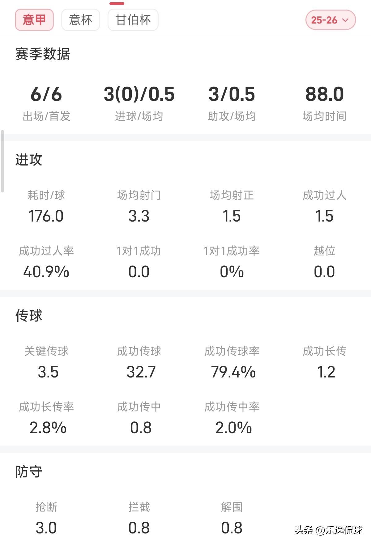 他的场均射门次数从3.1次升至3.3次,射正率从1.1次增至1.5次,进球转化率翻三倍达到15%,甚至完成了直接任意球破门。关键传球场均从1.5次升至3.5次,本赛季6场比赛已创造7次绝佳机会。更重要的是,他在进攻更具侵略性的同时,控球依旧稳健,半场控球率保持理性,展现出成熟思维。