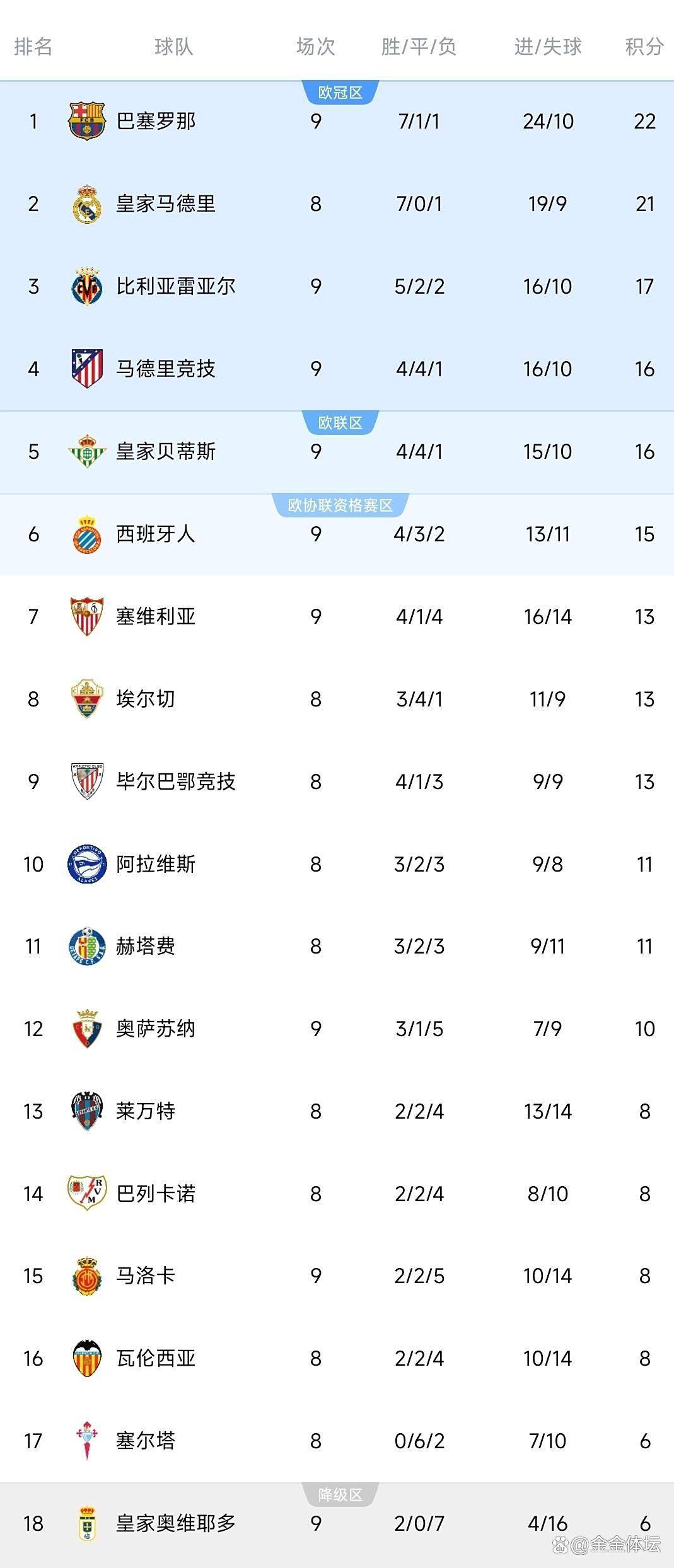 9轮战罢,巴萨以22分暂居榜首,皇马21分紧随其后。 但皇马少赛一场的局面,让巴萨的领跑充满不确定性。 比利亚雷亚尔17分排名第3,马竞、贝蒂斯同积16分分列4、5位。